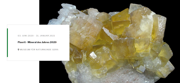 Aufgrund der erneuten, Corona-bedingten Museumsschließungen hat sich das Naturkundemuseum Gera entschlossen, alle Stufen der Kabinettausstellung „Fluorit – Mineral des Jahres 2020“ auf ihrer Homepage darzustellen. Durch Eingabe des Links https://www.museen-gera.de/museen/museum-fuer-naturkunde/ausstellungen in Ihren Browser (bzw. durch anklicken des Links) gelangt man auf die Seite des Naturkundemuseums und kann sich dort in aller Ruhe die Stufen anschauen.