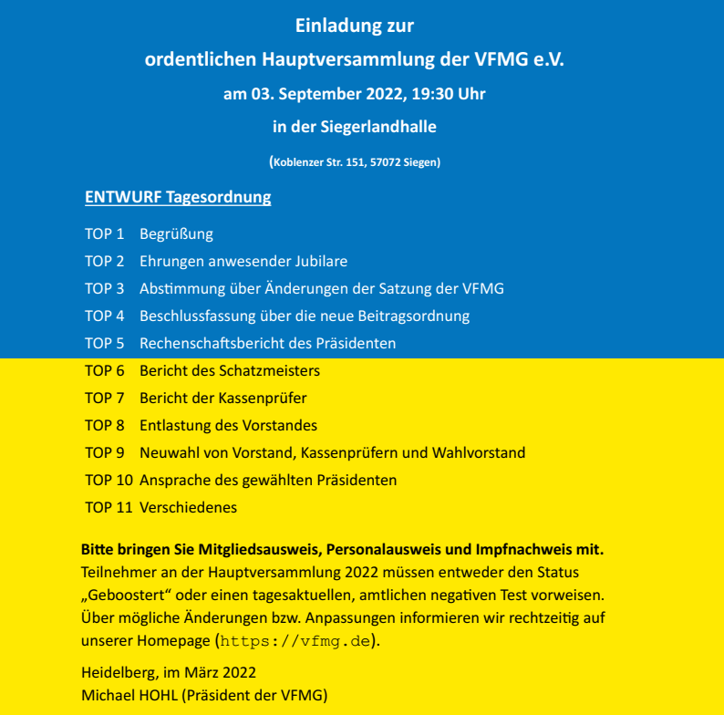 Für die VFMG gilt es, auch in den kommenden Jahren diverse Herausforderungen zu meistern, die mit dem Wandel der Gesellschaft, aber auch mit den aktuellen Krisen zusammenhängen. Gemeinsam mit dem neuen Vorstand möchte ich diese Aufgaben angehen, und bitte Sie, die Mitglieder und die Bezirksgruppen, um Ihre Unterstützung, auch bei möglicherweise schwierigen Entscheidungen.
