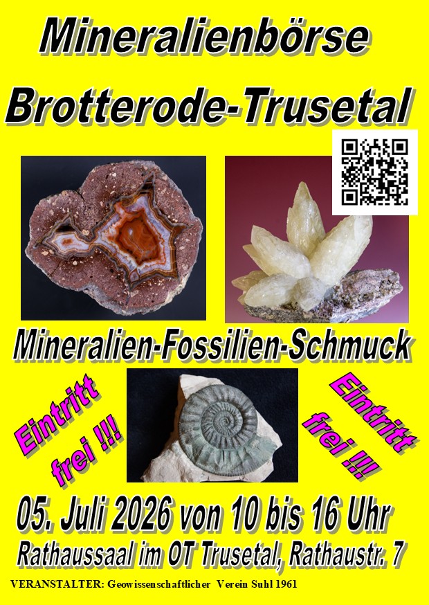 « Alle Veranstaltungen Mineralien- & Fossilienbörse zum Bergmannstag Brotterode-Trusetal 05.07.2026 @ 10:00 bis 16:00 Kostenlos « Mineralienbörse im Findlingspark Nochten 21. Lausitzer Mineralienbörse » Aussteller: 24 Besucher: 800 Eintritt: frei Sonderschau Zum Kalender hinzufügen Google Kalender iCalendar Outlook 365 Outlook Live Details Datum: 05.07.2026 Zeit: 10:00 bis 16:00 Eintritt: Kostenlos Veranstaltungskategorie: Börsen Veranstaltungsort Rathaussaal Trusetal Rathausstr. 7 Brotterode-Trusetal, 98596 Google Karte anzeigen Veranstalter Geowissenschaftliche Verein Suhl 1961 Telefon 01726263056 E-Mail GWV-Suhl1961@t-online.de