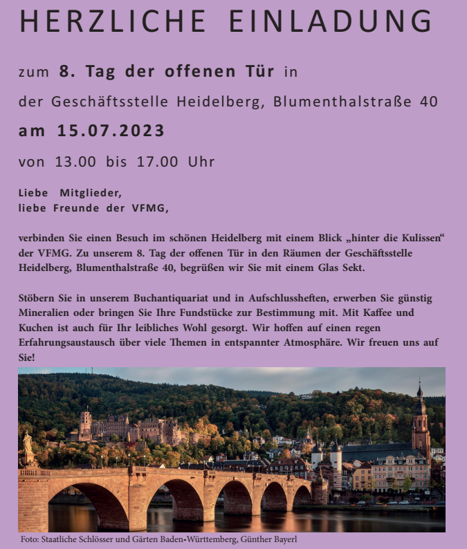 « Alle Veranstaltungen Diese Veranstaltung hat bereits stattgefunden. Tag der offenen Geschäftsstelle 15.07.2023 @ 13:00 bis 17:00 « 4. Fossilien & Mineralienbörse Stolpe 37. Mineralien- und Fossilienbörse in Imsbach am Donnersberg » Zum Kalender hinzufügen Google Kalender iCalendar Outlook 365 Outlook Live Details Datum: 15.07.2023 Zeit: 13:00 bis 17:00 Veranstaltungskategorie: VFMG-Veranstaltung Veranstaltungsort Geschäftsstelle der VFMG Blumenthalstr. 40 69120 Heidelberg, Google Karte anzeigen Telefon +49-(0)6221-413411 Veranstaltungsort-Website anzeigen Veranstalter VFMG e.V.
